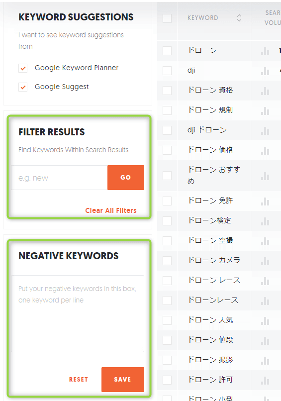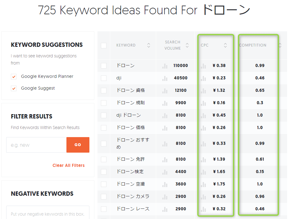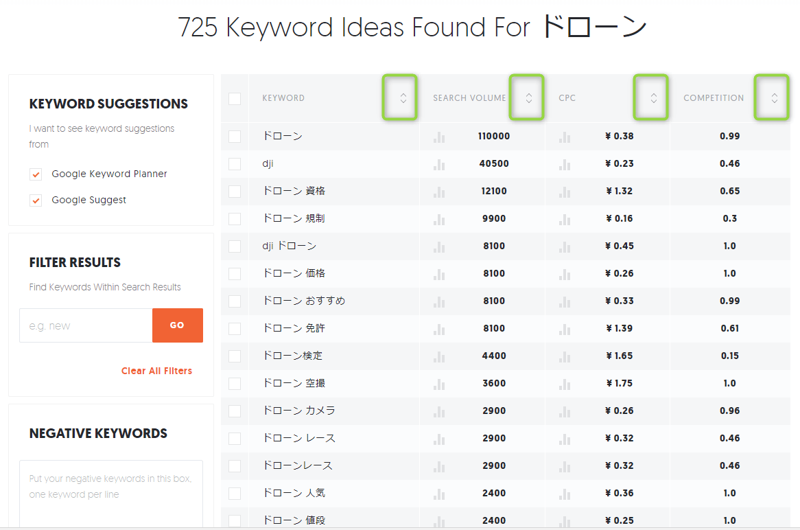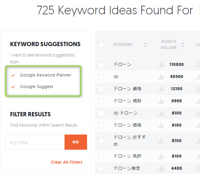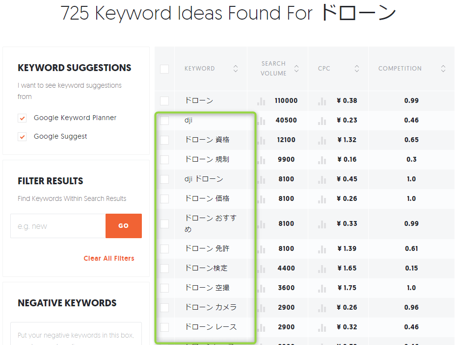 今回はキーワード「ドローン」で調べていますので、それ以外の緑枠の全てが「関連キーワード」と「検索ボリューム」となります。