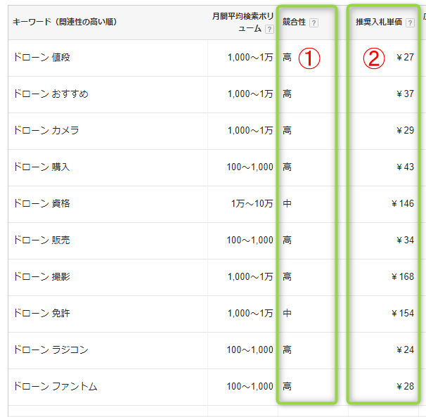 推奨入札価格(CPC)と競合度(COMPETITION)