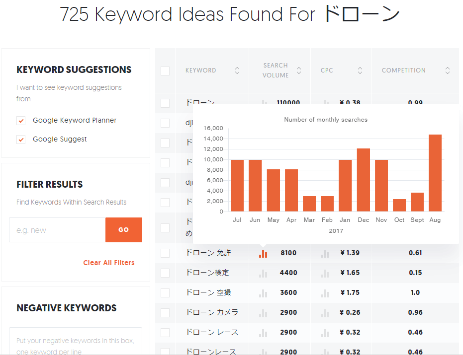 先ほど、広告出稿なしのキーワードプランナーで「ドローン 資格」を調べたところ、検索ボリュームは「1万~10万」でしたが、このウーバーサジェストで調べると、「12100」と出てきましたね。